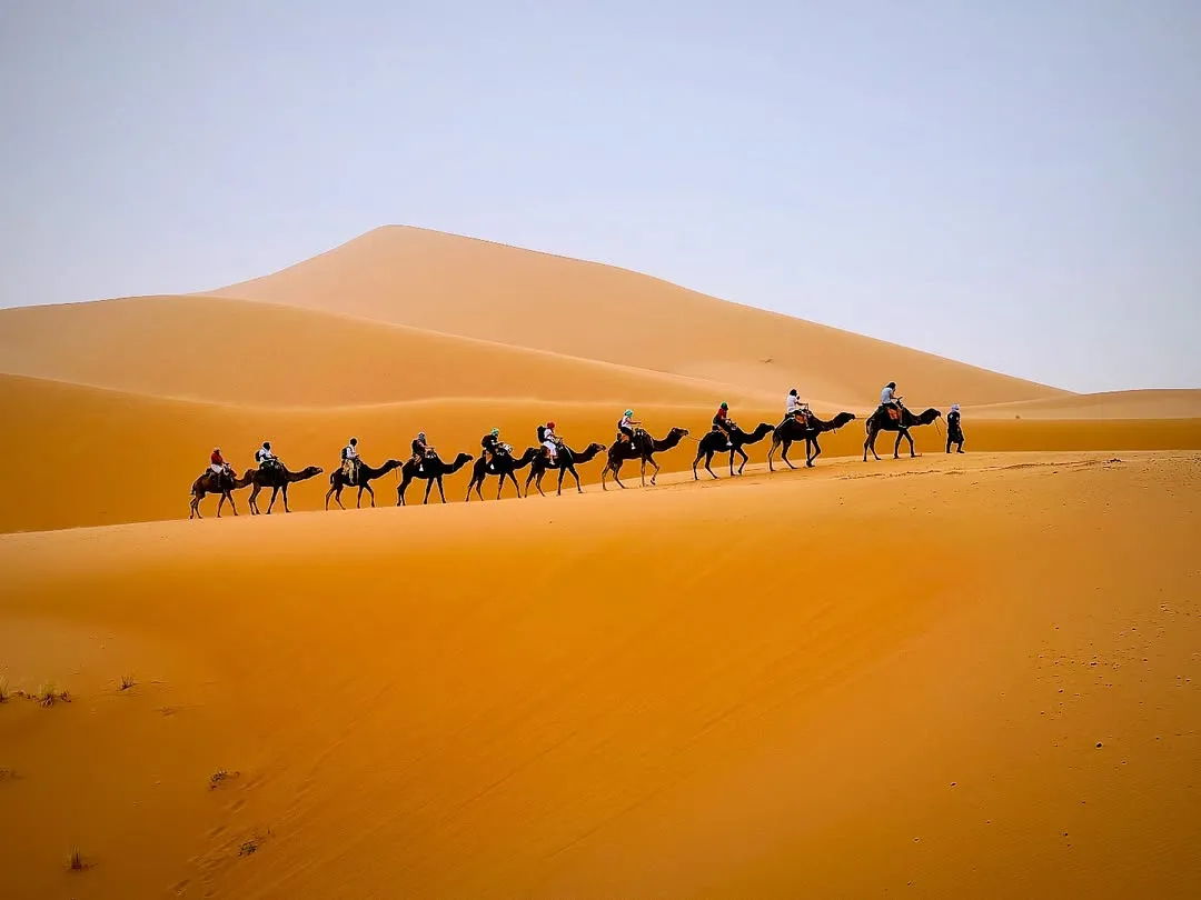 También viajarán al desierto de Merzouga, donde montarán en camello y pasarán la noche en un campamento en el desierto. El recorrido continúa por la famosa kasbah de Ait Ben Haddou antes de llegar a Marrakech, conocida por sus animadas calles, sus coloridos zocos y su rica historia.